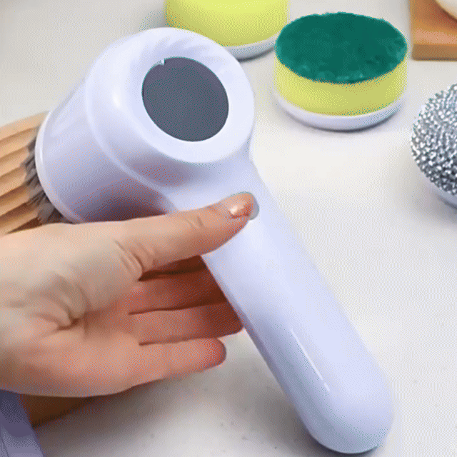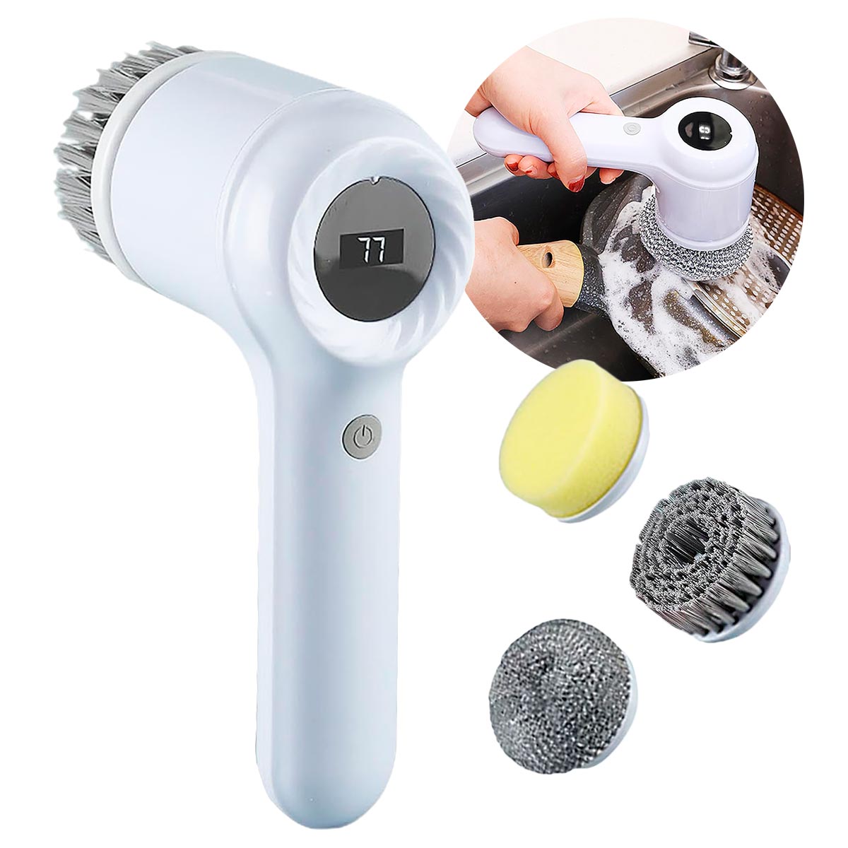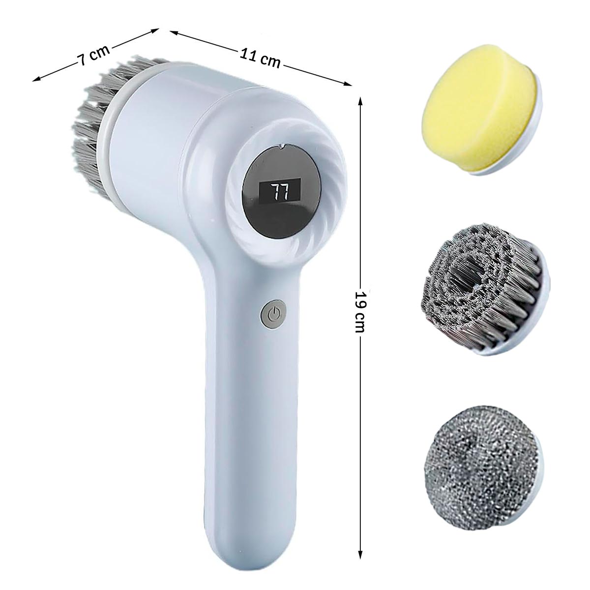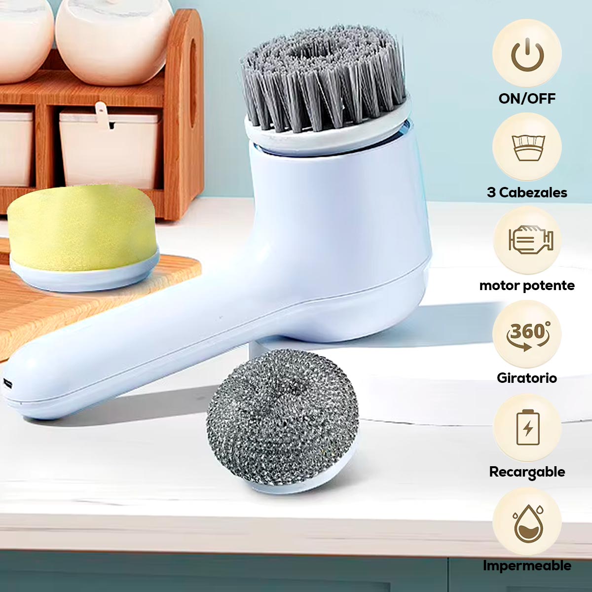 Tres cabezales intercambiables: Incluye un cepillo para limpieza profunda, una esponja para superficies delicadas y una esponjilla de brillo para ollas y sartenes.